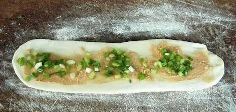 取一坨鸡蛋大小的面团,手掌压成长条,涂一层油后放上葱花。