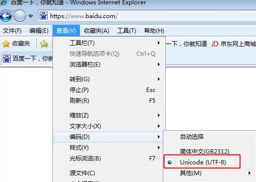 1、以IE浏览器为例,点击“查看”—“编码”,选择UTF-8编码;