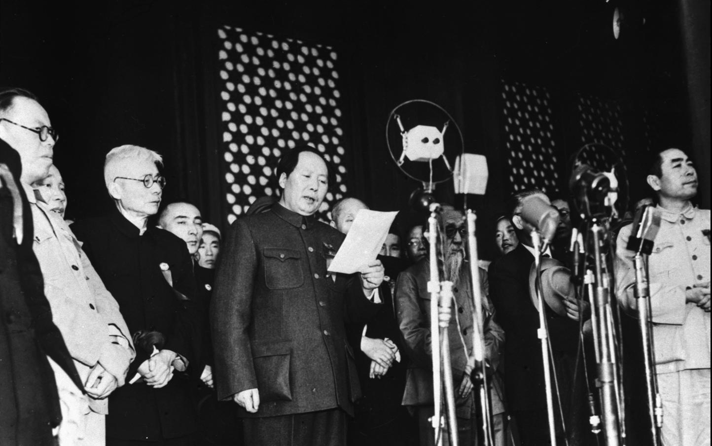 1949年10月1日下午3时,中华人民共和国举行开国大典,毛泽东在北京天安门城楼上宣告中华人民共和国、中央人民政府成立了。10月1日下午3时,大地欢声雷动。刚刚就职的中华人民共和国中央人民政府主席毛泽东和朱德两位伟人一前一后,最先登上了天安门城楼。当林伯渠宣布开始后,在代国歌《义勇军进行曲》的乐曲声中,中央人民政府主席、副主席和委员就位。人民领袖毛泽东庄严宣布:“同胞们,中华人民共和国中央人民政府今天成立了!”