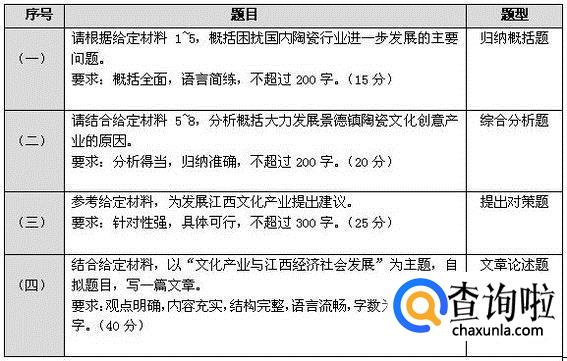 申论全部都是主观题,跟学生时期做的语文的阅读理解差不多,考试一共是3个小时,满分是100分,一共有5道题,前4题都是资料分析题,第5题是大作文。