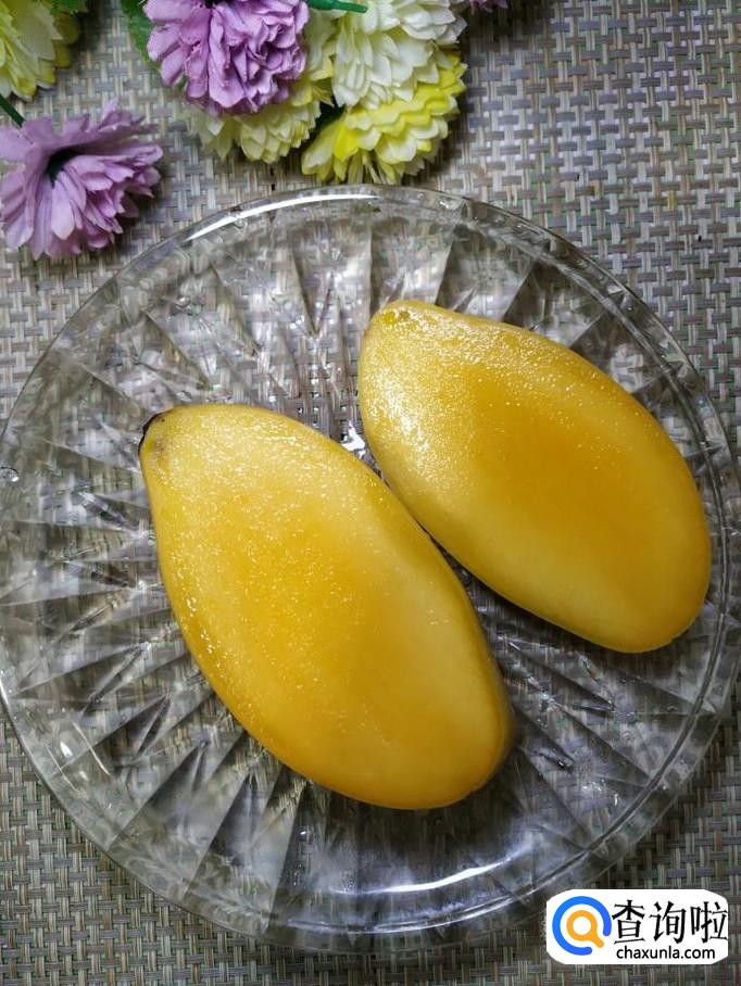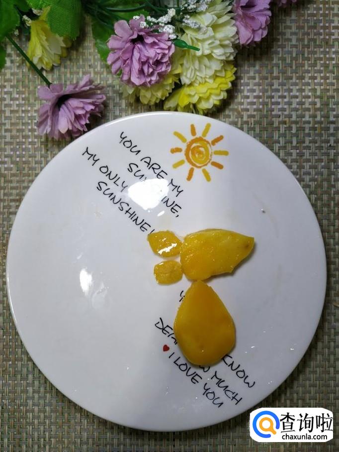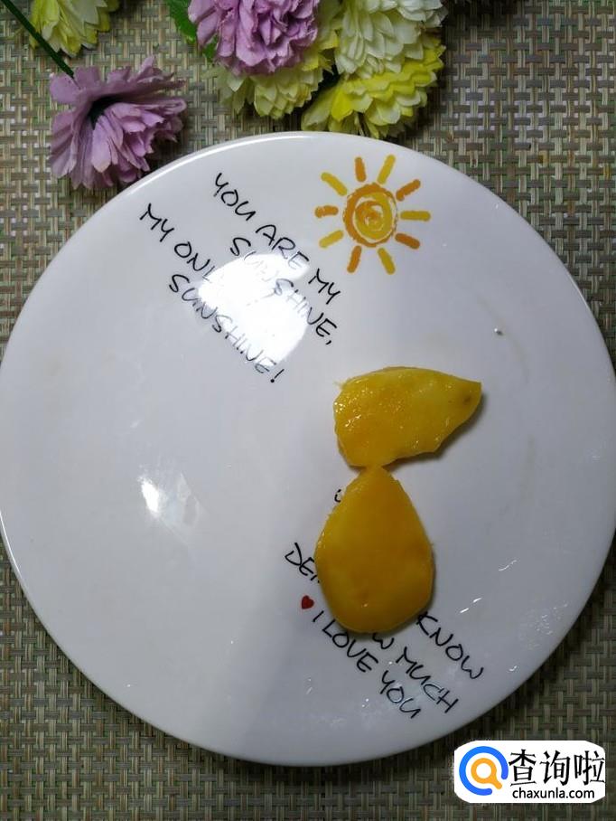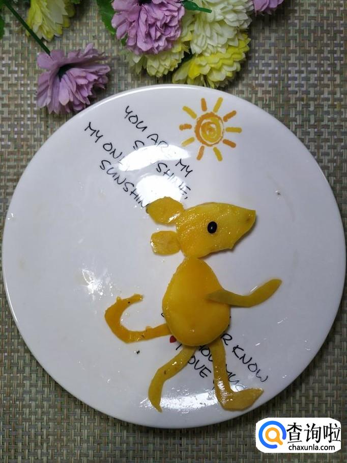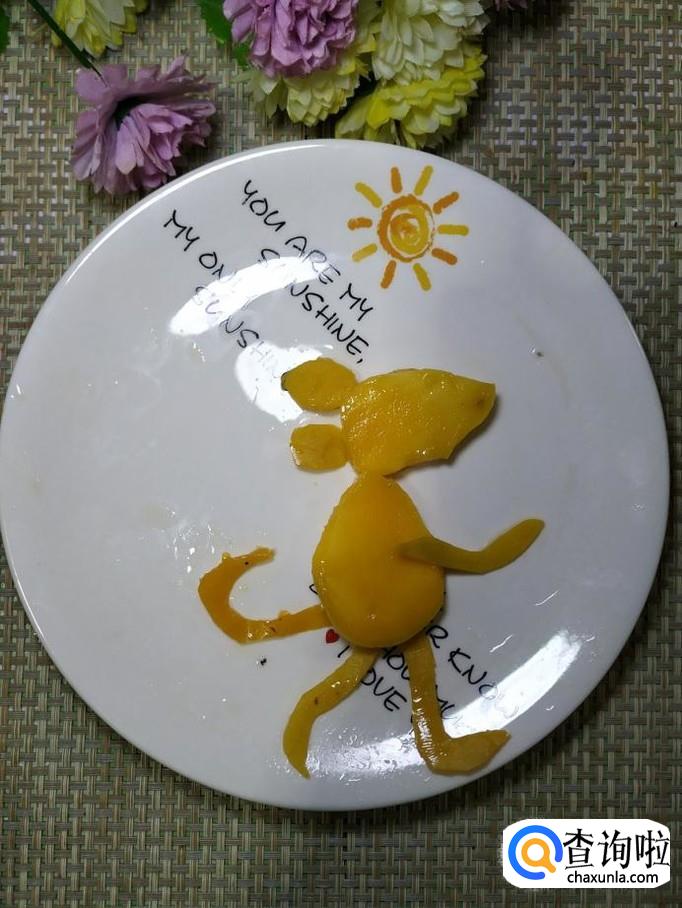 再用芒果做成圆形,放在上面,做成老鼠的耳朵,然后用芒果皮剪出老鼠的腿部,尾巴和胳膊部分,用黑豆做老鼠的眼睛。