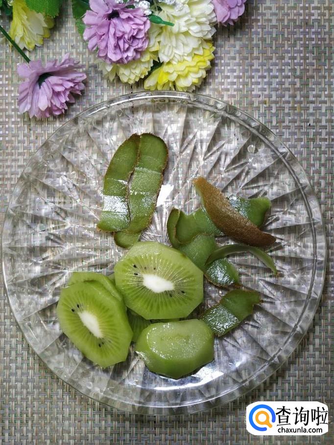 将猕猴桃去皮后,切成片,然后再切成三角形,做成松树的叶子,然后用猕猴桃的皮做的树干。