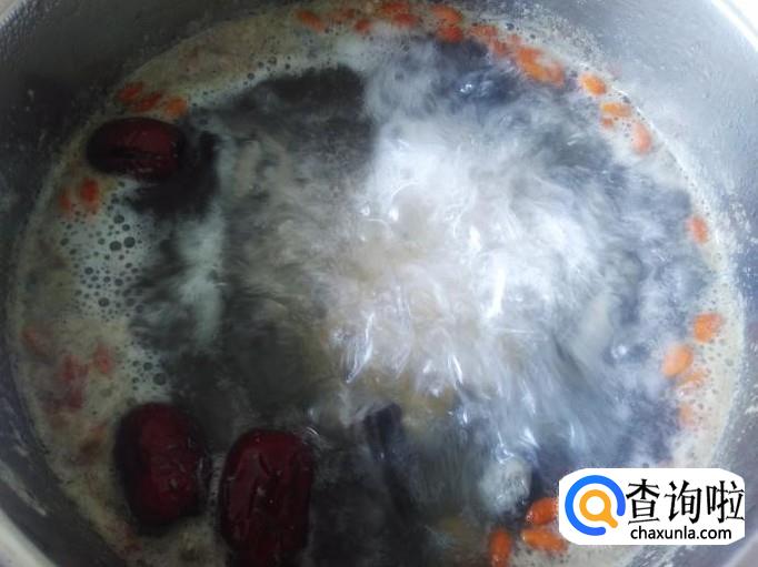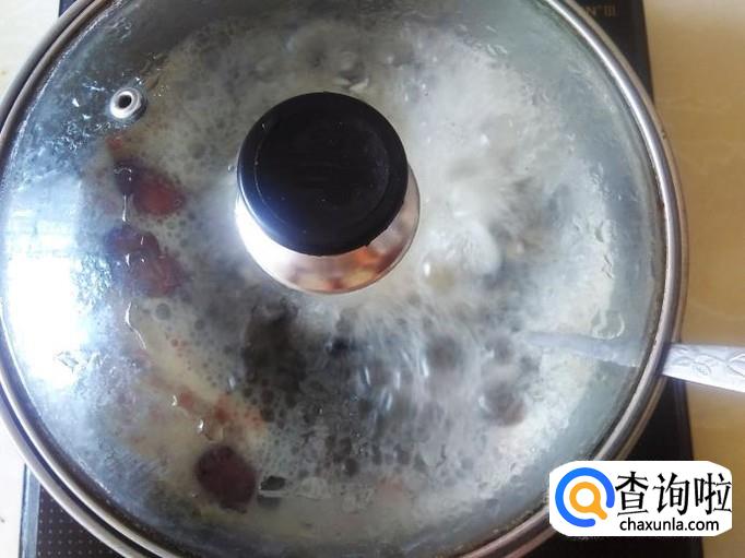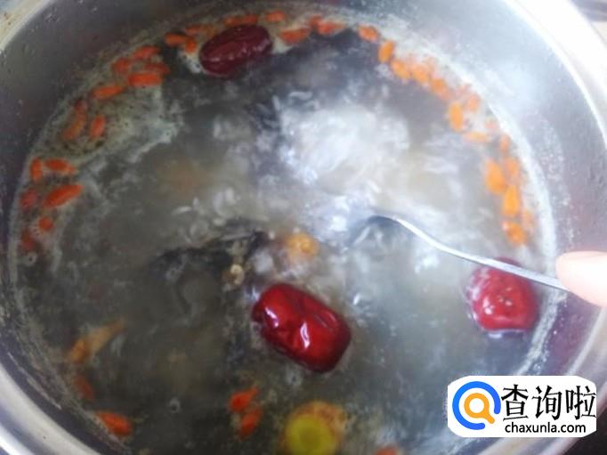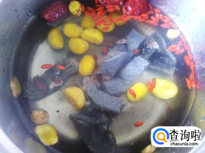 锅装4碗水左右,然后放乌鸡、板栗、红枣、枸杞进去。
