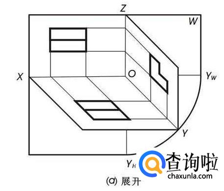 为使三视图位于同一平面内,需将3个互相垂直的投影面摊平。方法是:V面不动,将H面绕Ox轴向下旋转90°,W面绕Oz轴向右旋转90°。