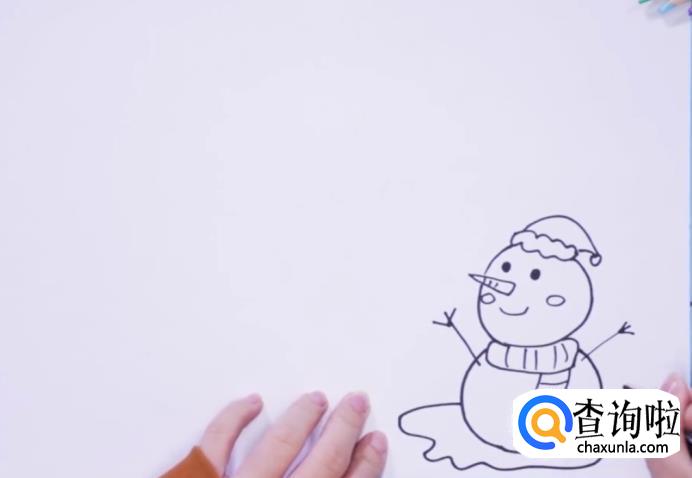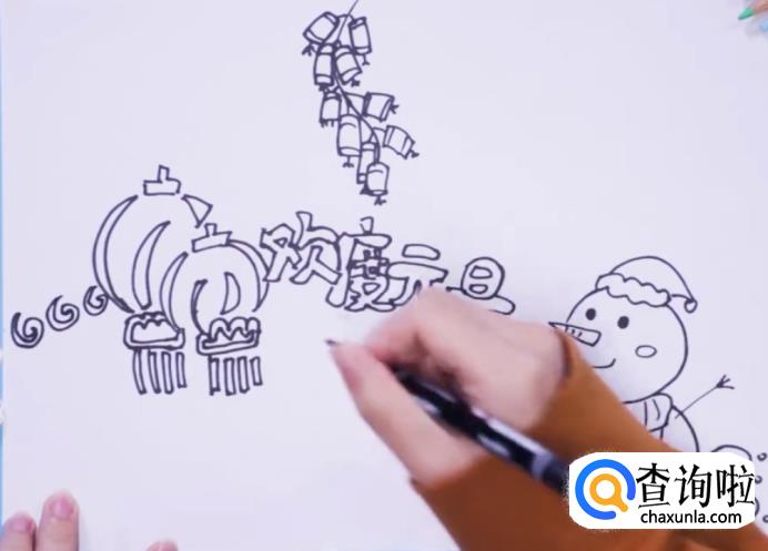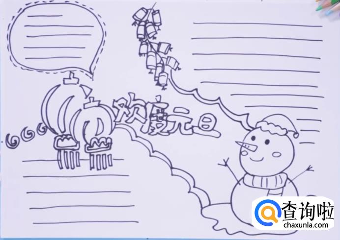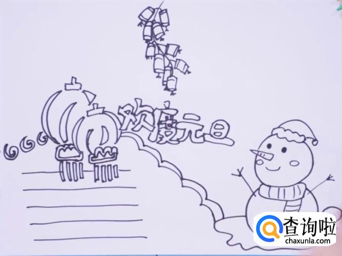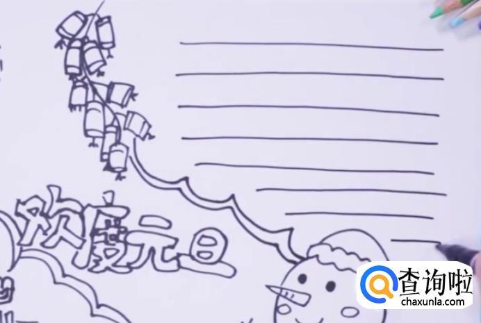 右边鞭炮用线条连接雪人,右上角空白处画一些横线,也可以安排文字。最后也可以根据自己的喜好涂上颜色,元旦手抄报就做好了。