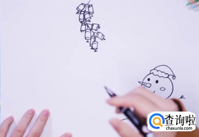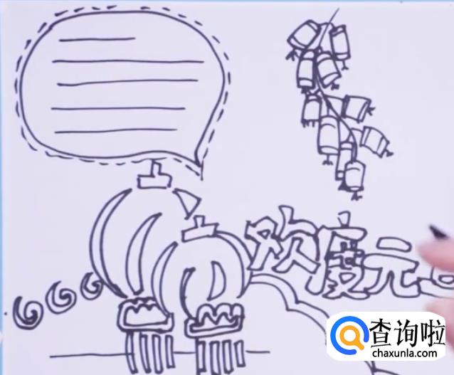 灯笼和雪人用波浪线连接起来,然后灯笼下方画一些横线,手抄报的文字可以写在这里。