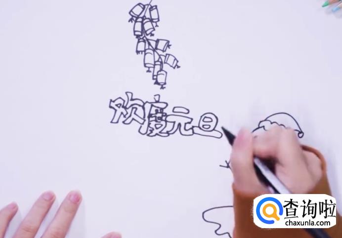 在鞭炮下写上欢度元旦几个字,此处大致将鞭炮和雪人连接起来了。