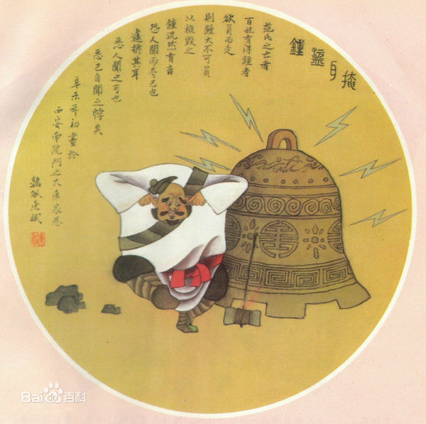 春秋时候,晋国世家赵氏灭掉了范氏。有人趁机跑到范氏家里想偷点东西,看见院子里吊着一口大钟。钟是用上等青铜铸成的,造型和图案都很精美。小偷心里高兴极了,想把这口精美的大钟背回自己家去。可是钟又大又重,怎么也挪不动。他想来想去,只有一个办法,那就是把钟敲碎,然后再分别搬回家。