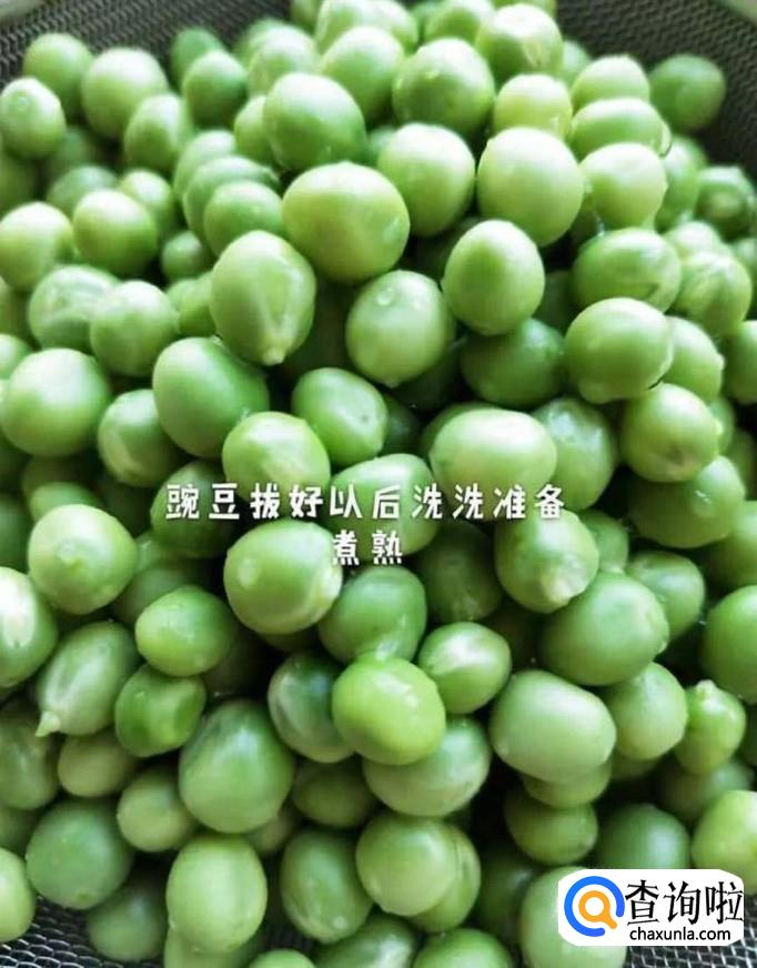 接着把剥好的豌豆清洗干净,倒入锅中煮熟,捞出控干,如下图所示。小贴士:大家在煮豌豆的过程当中可以加入一些食用盐和食用油,这样煮出来的豌豆才会更加漂亮。