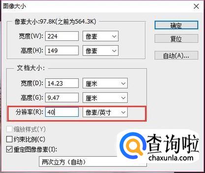 将图片的分辨率改小,如图,小编改成了40,然后点击右上方的"确定"。这样图片的分辨率就改小了,但是清晰度还是不变的。