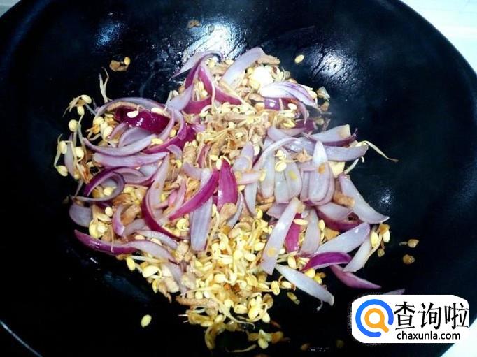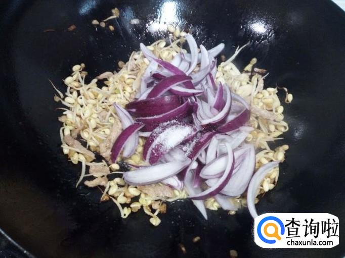 黄豆芽翻炒一分钟的时间(这种黄豆芽没有完全发完牙,稍带些黄豆,要多炒一会),放入圆葱翻炒,放入盐,滴少许醋。炒至圆葱断生,放入味精,关火出勺。