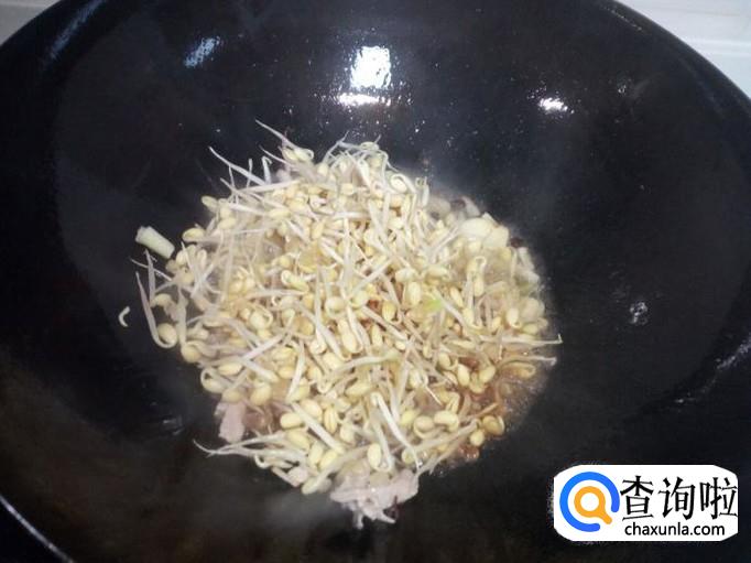 炒至肉丝颜色微白,放入葱,姜,蒜,料酒,翻炒。随即放入黄豆芽翻炒,放少许酱油。