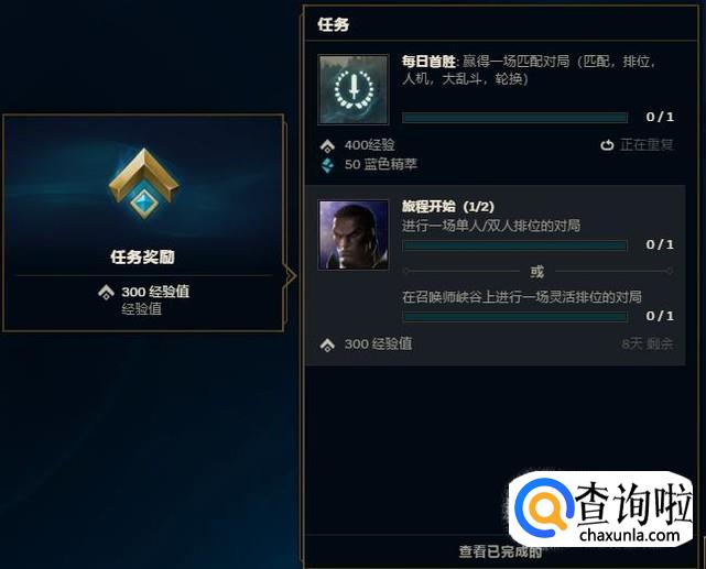 在英雄联盟客户端的任务里会不时地出现任务,任务有的可以获得大量经验,有的可以获得精粹。