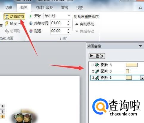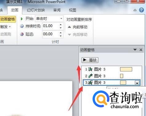 点击动画窗格,右侧窗格中就显示了三个动画的播放顺序。