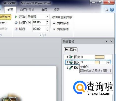 如果想把第二第三的顺序颠倒过来,对着最底下的动画“翻转式由远及近”按住不放拉动到第二个动画上面放手。这样就调整了动画播放顺序了。