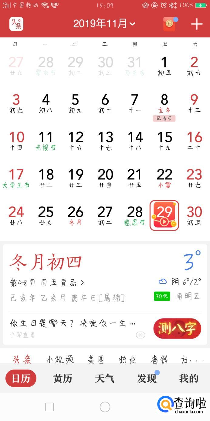 打开之后,我们就可以看见“日历”了,下面红色字体的日期,就是黄历基本信息了。