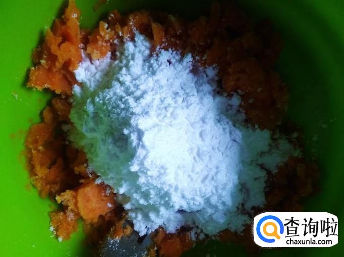 用叉子把红薯压成薯泥,加1勺奶粉进去搅拌均匀。【放奶粉的丸子就会有奶香味】