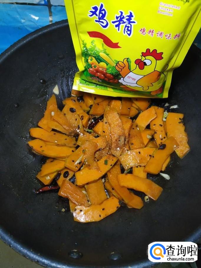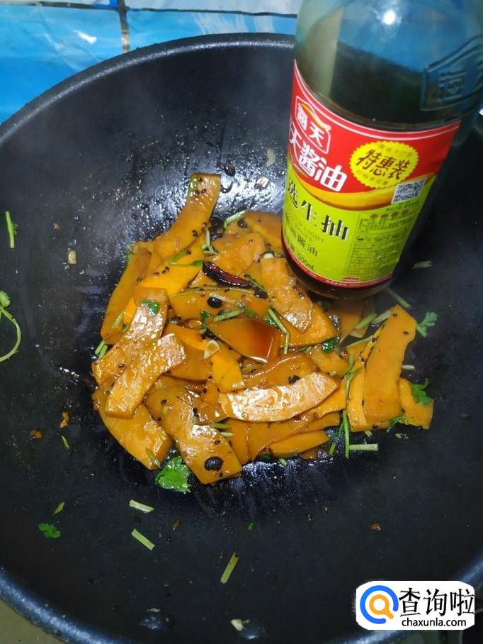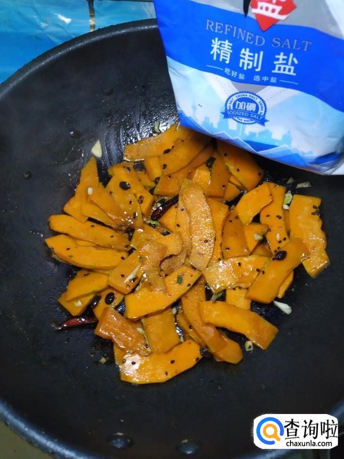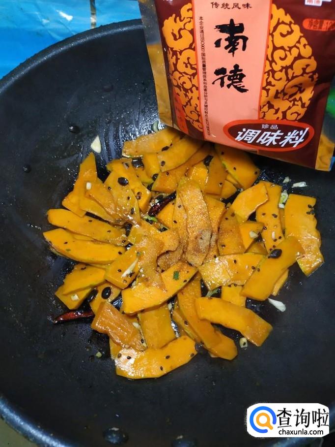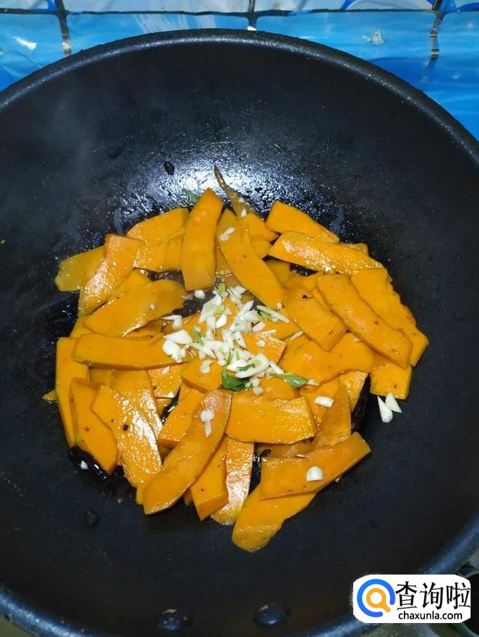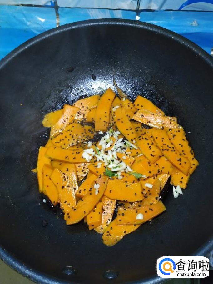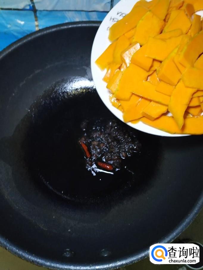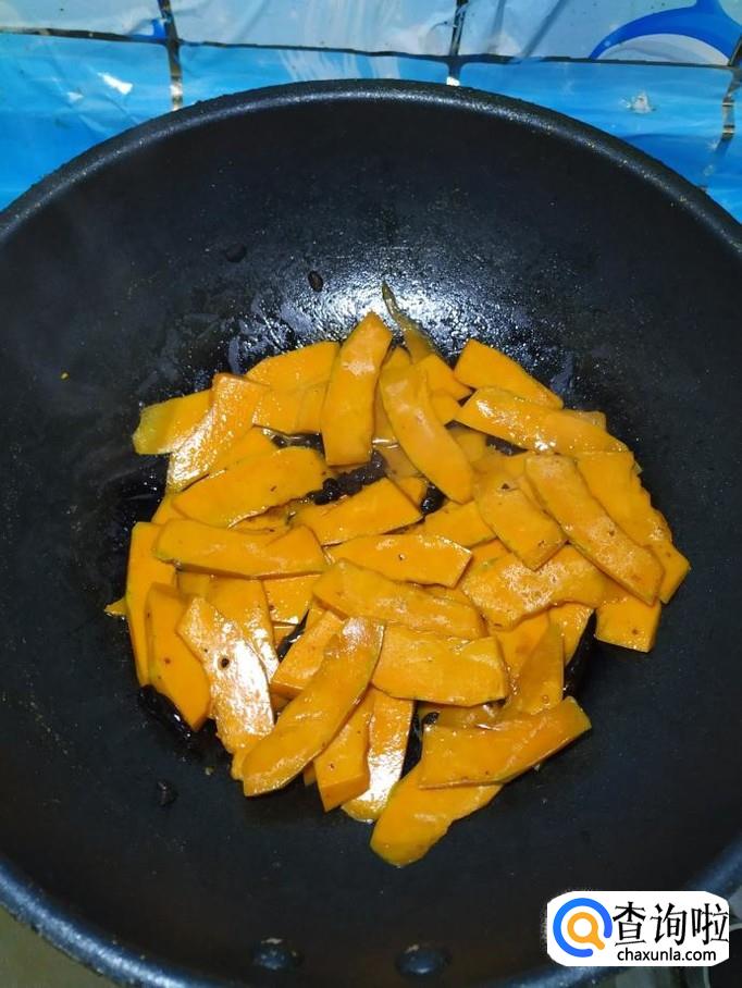 将泡好的南瓜沥干水分,倒入锅中,翻炒均匀。