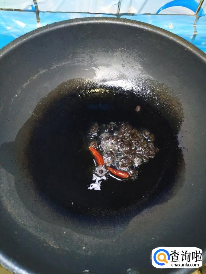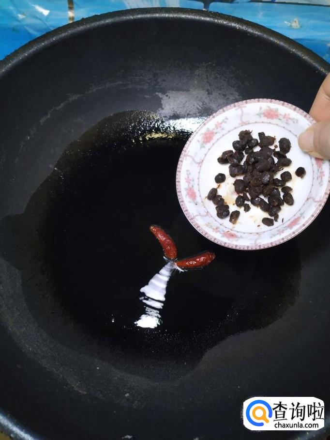 再准备适量豆豉,炒锅中放入适量油,油热后,放入干辣椒和豆豉炒香。