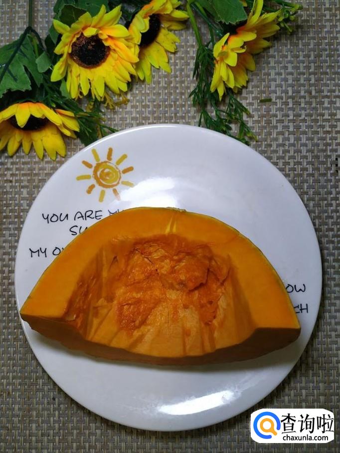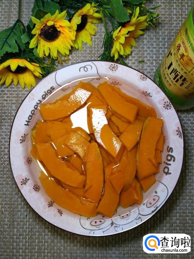 准备一块南瓜,洗净后去皮,切成片,放入碗中,加入适量清水和白醋,泡十分钟左右。