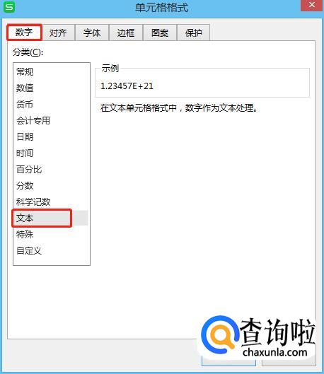 打开“设置单元格格式”对话框,在【数字】下级菜单中选择“文本”选项,然后点击“确定”。