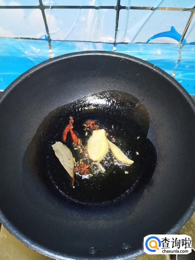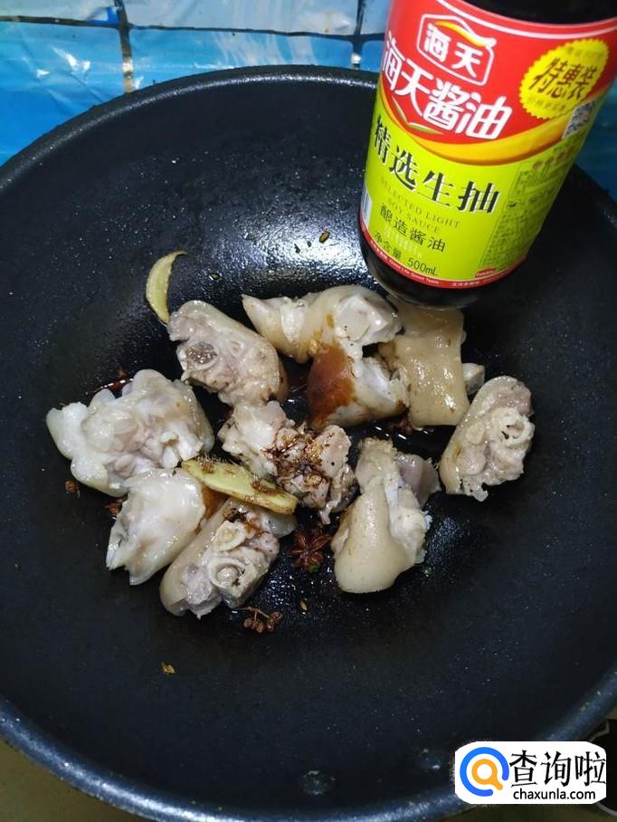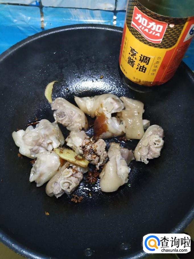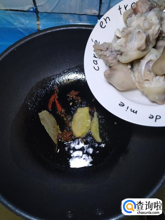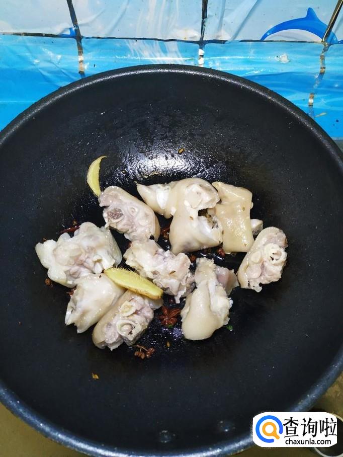 炒锅中放入适量油,热后放入姜片,干辣椒,花椒,八角,桂皮,香叶等大料炒香。然后将猪蹄子倒入锅中,翻炒一下。