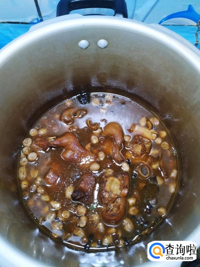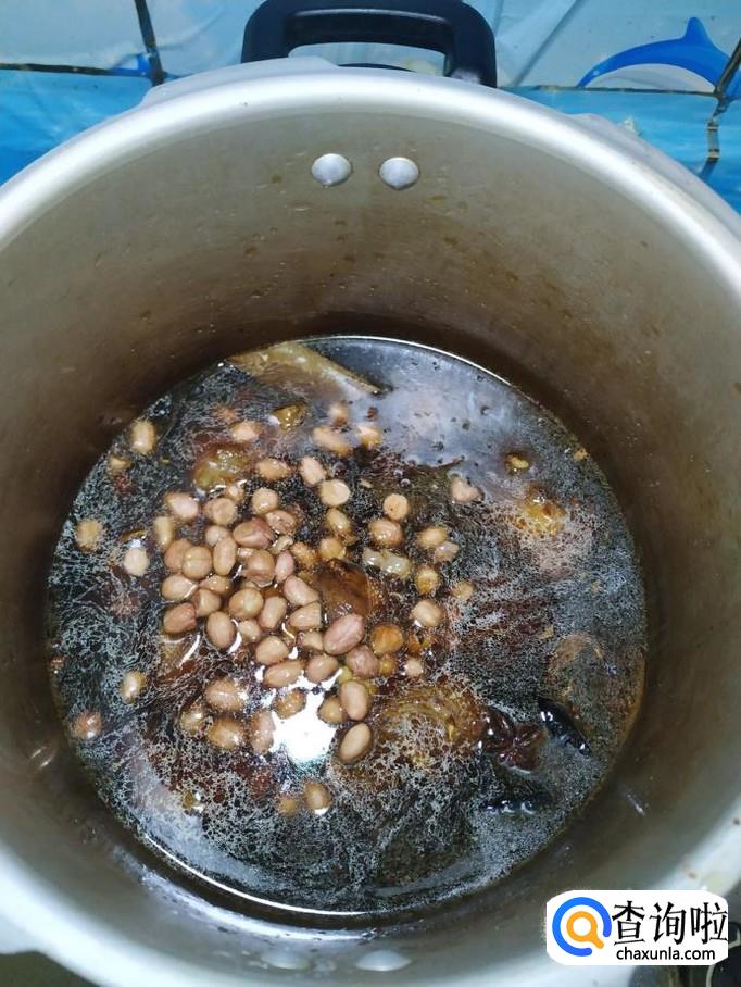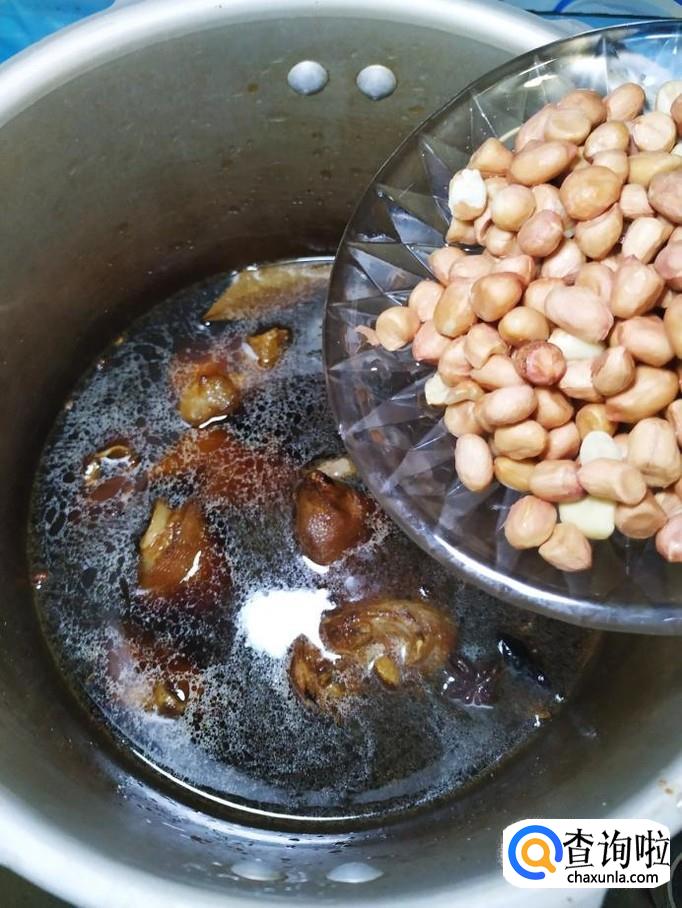 然后将猪蹄子和料水全部移进高压锅中,再准备适量花生,洗净后,用清水泡一会儿,倒入锅中。