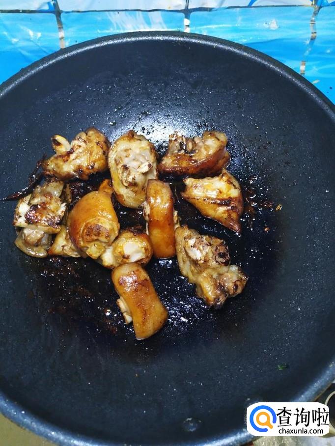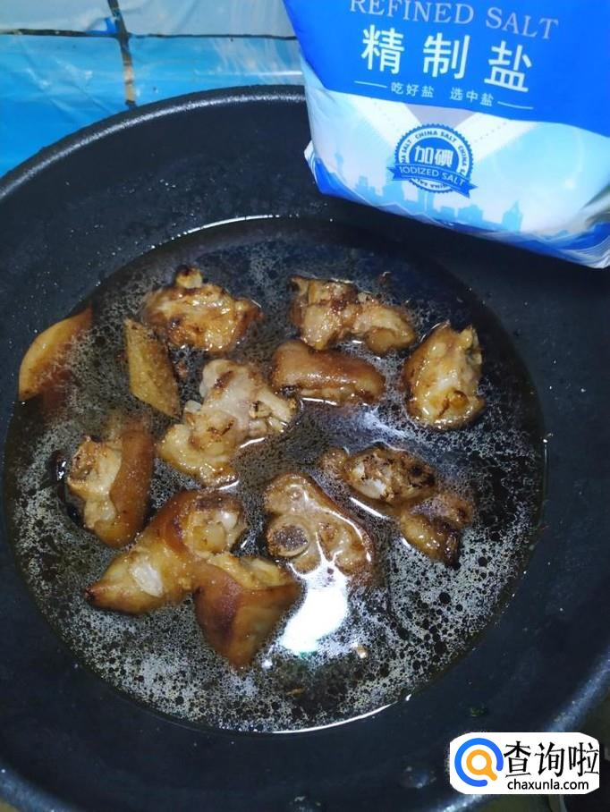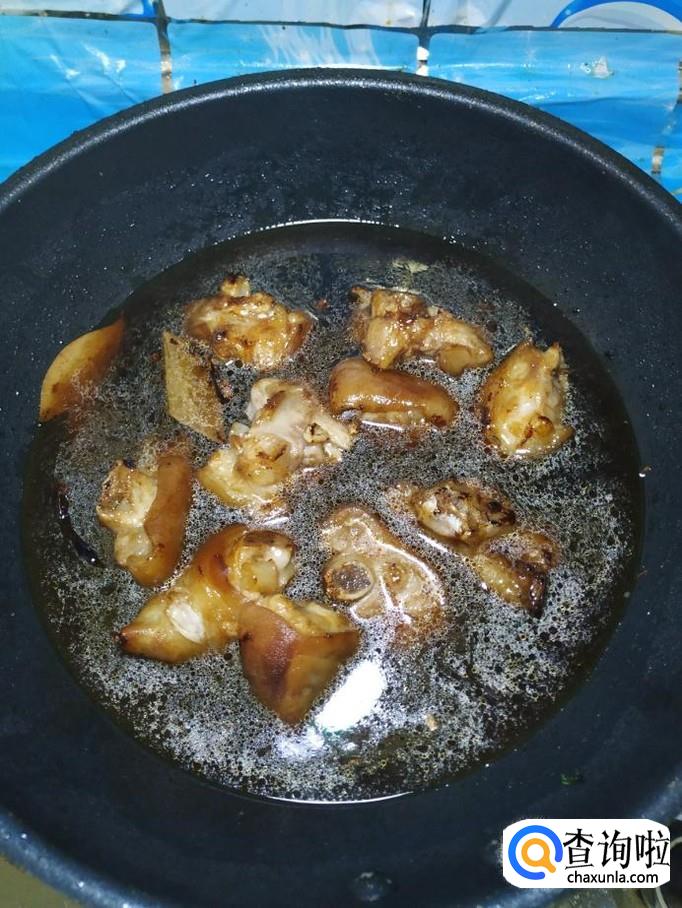 炒至冰糖融化,让猪蹄子均匀的沾上一层焦糖色,加入一碗清水,清水的量,要没过猪蹄子,然后加入适量食盐。