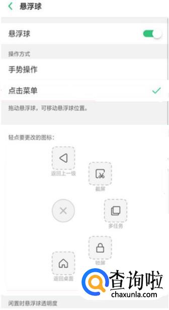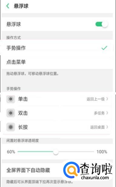 打开【悬浮球】开关,还可以进行进一步设置。如将操作方式设置为【手势操作】,手势操作包括:单击是返回上一级、双击是多任务、长按是返回桌面。