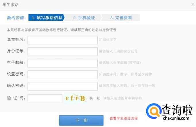 然后填写激活信息。这里以学生激活为例,填写学生本人姓名,身份证号,密码以及验证码。如果激活成功,直接进行手机验证,完善信息。