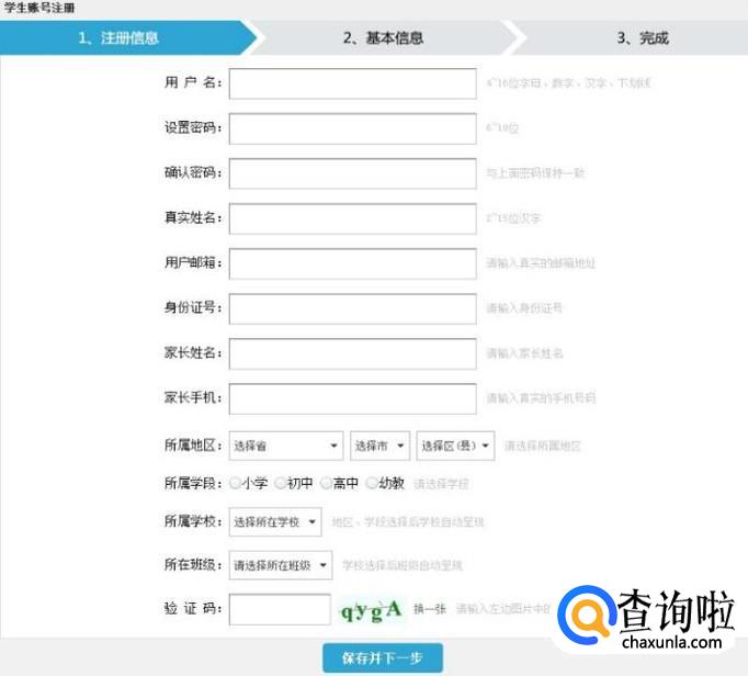 填写注册信息,主要填写学生的姓名、身份证号,家长姓名,家长真实手机号以及所属学校和班级等。然后再完善基本信息。