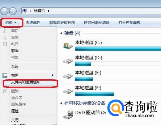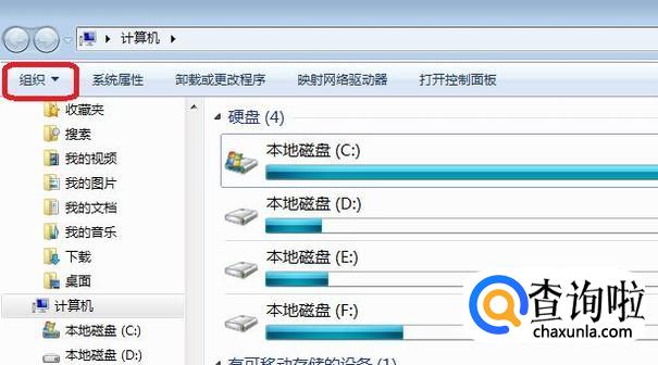 首先,打开“计算机”(即XP中的“我的电脑”),如图所示,点击“组织”。