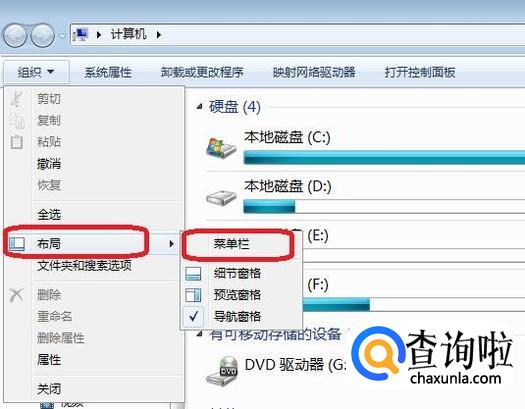 弹出下拉菜单,选择“布局”,然后扩展菜单中点击勾选“菜单栏”。