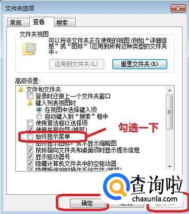 出现选项框,我们点击“查看”标签,把里面的“始终显示菜单”勾选上,点击应用、确定就可以了,效果是一样的。