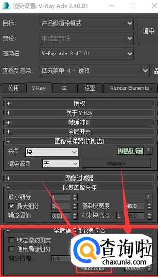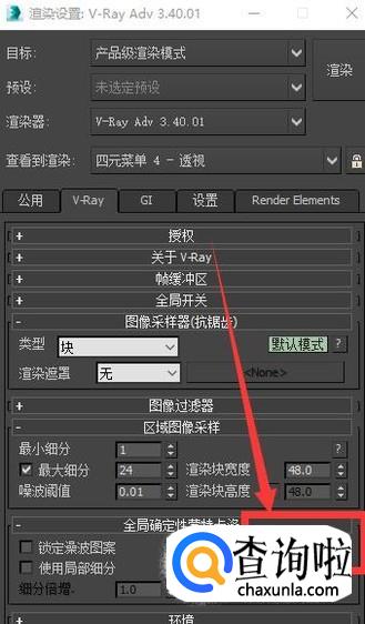 在V-Ray选项下找到并点击打开【全局确定性蒙特卡洛】