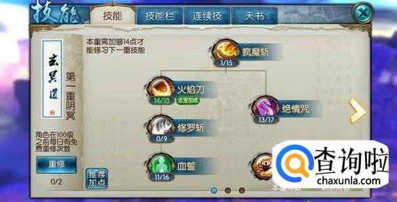 在第一重阶段的时候,主要点封魔斩以及火焰刀这两个技能,每个1点,并且绝情咒和血誓都要点满,修罗斩不要点。
