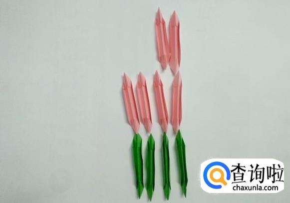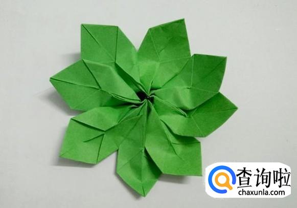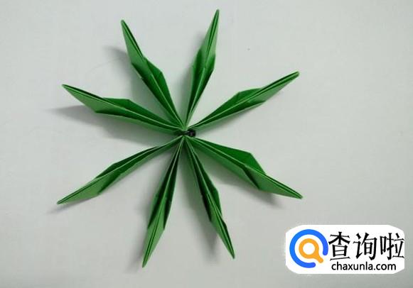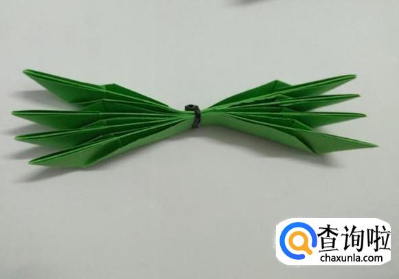 绿色的折纸也同样绑好后向上翻折成花朵状。