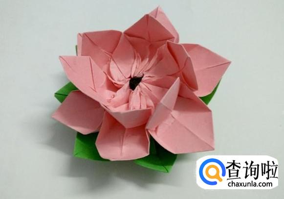把粉色的花朵放到绿色的上面,荷花就折好了。(也可以用胶水把粉色花朵和绿色叶子粘在一起)
