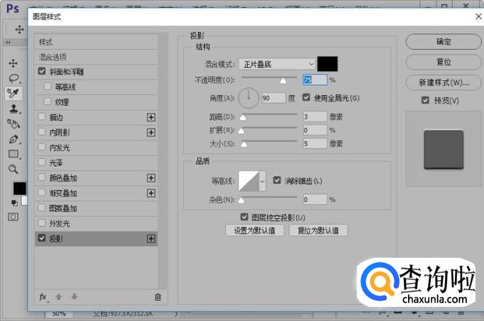 然后我们给图层 1添加图层样式投影,参数如图所示。