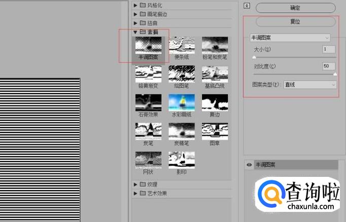接下来我们给图层 1添加半调图案滤镜效果,参数如图所示。