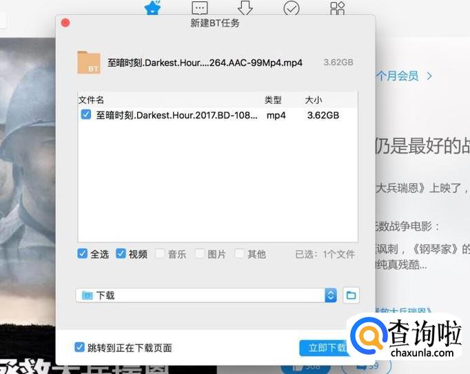 立即下载完成之后会弹框提示新建BT任务,点选需要下载的种子文件,点击“立即下载”