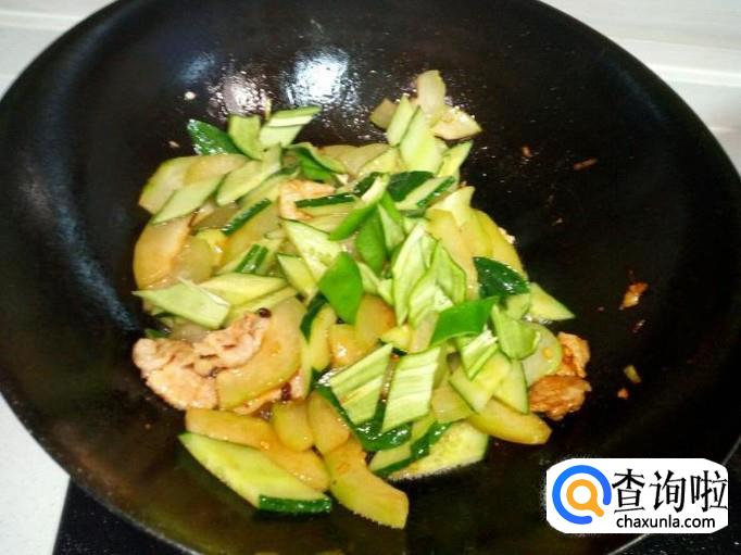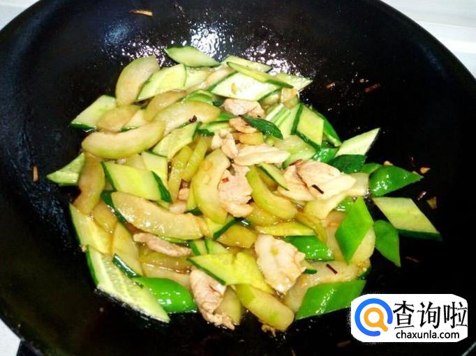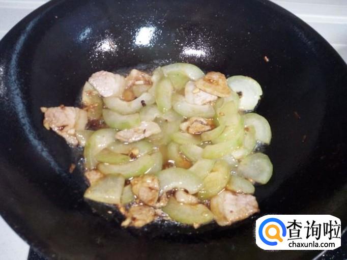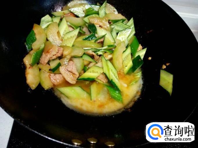 炒至肉片颜色微白,放入冬瓜翻炒。