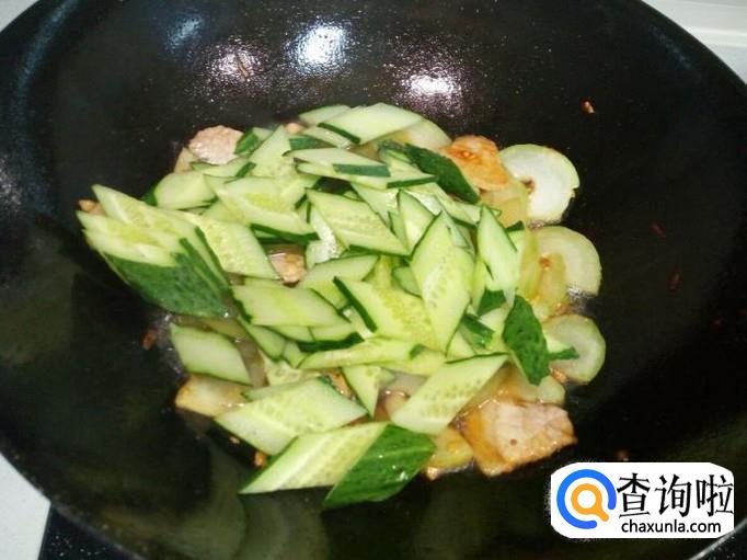 冬瓜稍翻炒一下,放入黄瓜翻炒,放入盐。
