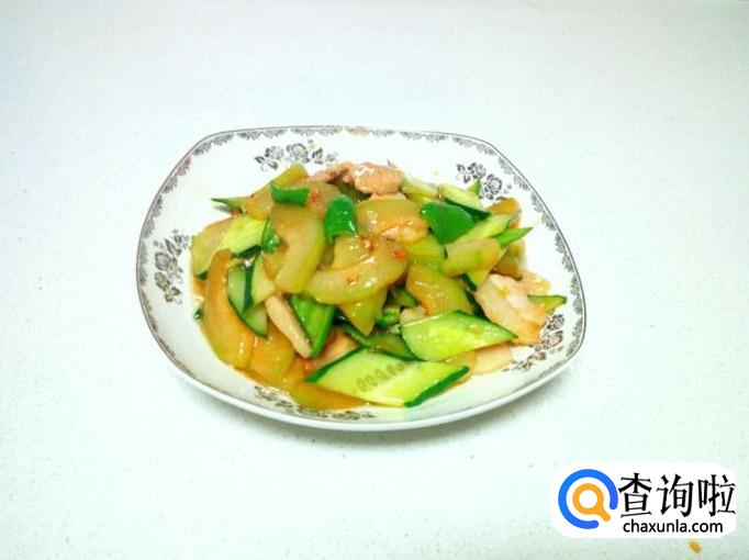 炒至冬瓜,黄瓜断生,放入勾兑好的芡汁,芡汁粘稠后,放入味精,关火出勺。