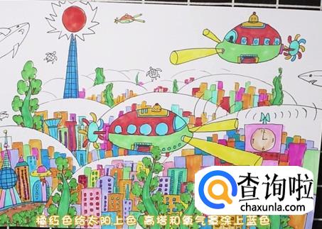 再来给氧气罩里的楼房涂上各种五彩的颜色,太阳塔涂上蓝色和红色。