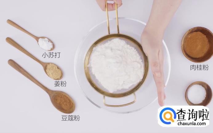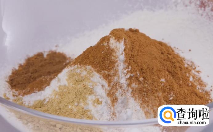 将低筋面粉过筛,与盐、肉桂粉、小苏打、姜粉和豆蔻粉这些干料混合在一起。