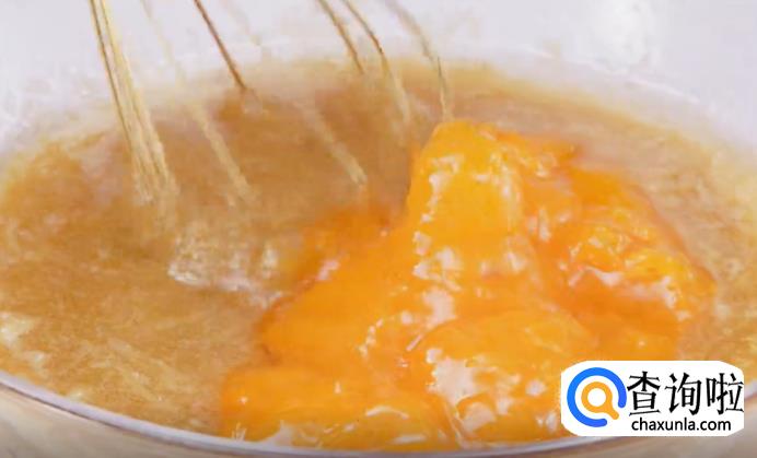 将备好的柿子肉放进来,制作成湿料。