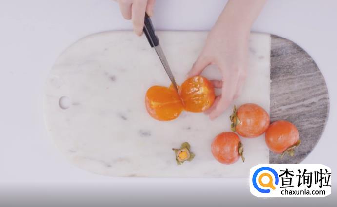 将准备好的奶油柿对半切开,再用勺子将柿子肉舀出来,装在碗里。