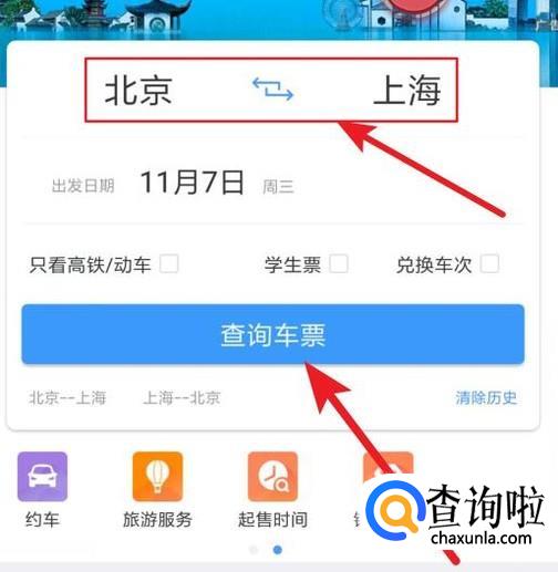 打开12306APP,先选择起点和重点,还有出发时间,选择查询车票。