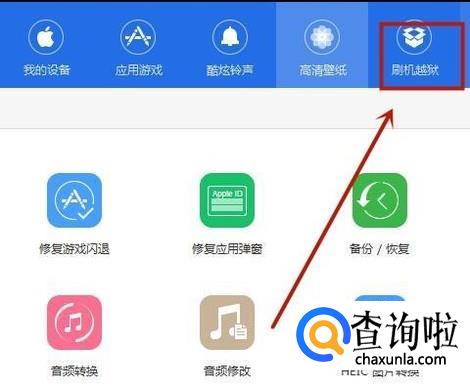 接着点击屏幕上方的“刷机越狱”,如下图所示。